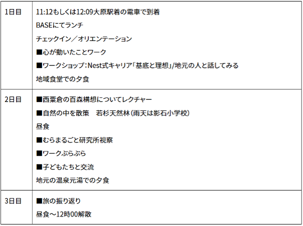 西粟倉の場合、例えば、こんな2泊3日の旅をしながらの留学となります。