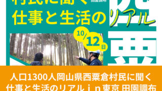 お知らせ 「人口1300人岡山県西粟倉村民に聞く 仕事と生活のリアル in 東京 田園調布」就職説明会開催! カジュアルな座談会風の就職説明会!途中入退場もOKです。出展者はみんな西粟倉村民。村の雰囲気や、移住者が多い理由、どんな仕事があるのか、リアルな話をしましょう!暮らして分かった「実際どう?」の本音は、... 2025.10.07 お知らせローカルベンチャー新着情報
