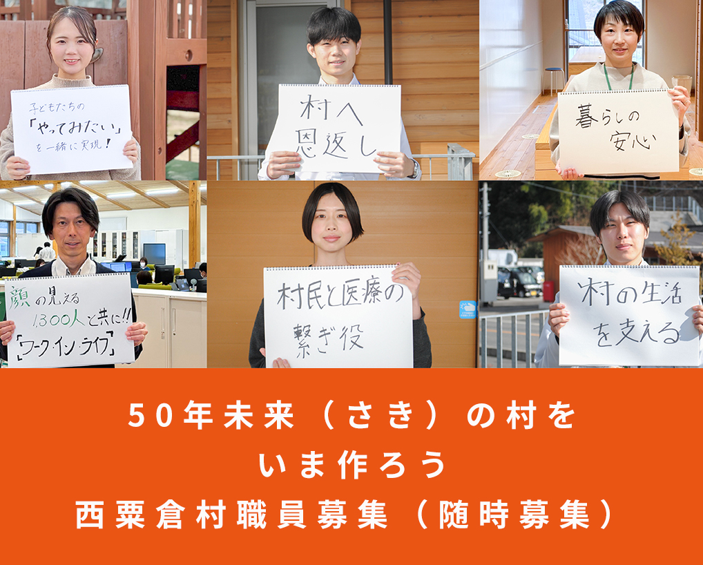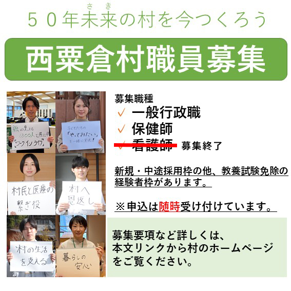 西粟倉村役場より採用情報のご案内(随時募集) 2025.11.30 ~村民の生きるを支え、新たなチャレンジを続ける~西粟倉村 職員募集!!西粟倉村役場職員として勤務いただく方を募集しています。小さな村の役場は、業務が多岐に渡り、大変なこともありますが、行ったことに対する住民のみなさんのリアクションがすぐに近くで見えるやりがいのある仕事です。令和8年度のスタートに向けて、新規・中途・経験者など、随時募集を行っています。募集職種一般行政、保健師(看護師の募集は終了しました) 募集締め切り:随時募集は随時受け付けています。役場のページが開きます。