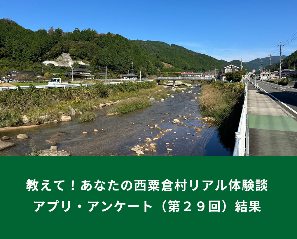 今回も、前回に引き続き、アプリ村民の方が他のアプリ村民の皆さまに聞いてみたいこと!として、「教えて!あなたの西粟倉村リアル体験談」と題し、アプリ村民が西粟倉村に来る際の手段や、実感している魅力等について、皆さまのご意見を伺いました。