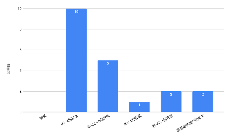 「年に4回以上」の頻度で訪れている方が最も多く、リピーター層が中心となりますが、「直近の訪問が初めて」の方など、幅広い方がご回答者にいらっしゃいました。