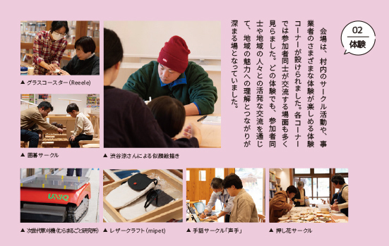 会場は、村内のサークル活動や、事業者のさまざまな体験が楽しめる体験コーナーが設けられました。各コーナーでは参加者同士が交流する場面も多く見らました。どの体験でも、参加者同士や地域の人々との活発な交流を通じて、地域の魅力への理解とつながりが深まる場となっていました。