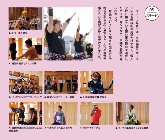 年齢やジャンルを超えた発表には、村の多彩な文化の広がりと、人々の個性が感じられる内容が多く見受けられました。