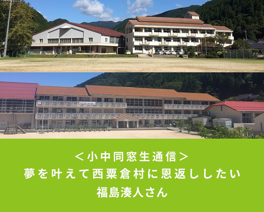私の将来の夢は教師になることです。今年の秋には教育実習で1週間ほど西粟倉小学校に伺いました。来年以降も実習をさせていただく予定であり、西粟倉で学びながら、将来教師としてこの地に恩返しできればと考えています。
