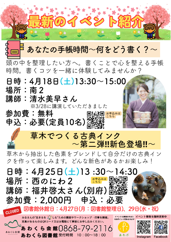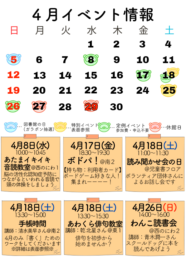 図書館休館日:4月27日(月:図書館整理日)、29日(水・祝)
