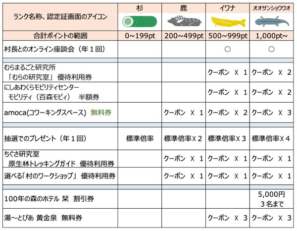 - 会員ランクは、前年度の獲得ポイントによって「杉」→「鹿」→「イワナ」→「オオサンショウウオ」のいずれかに決定されます。ランクに応じて1年間様々な特典が提供されます。